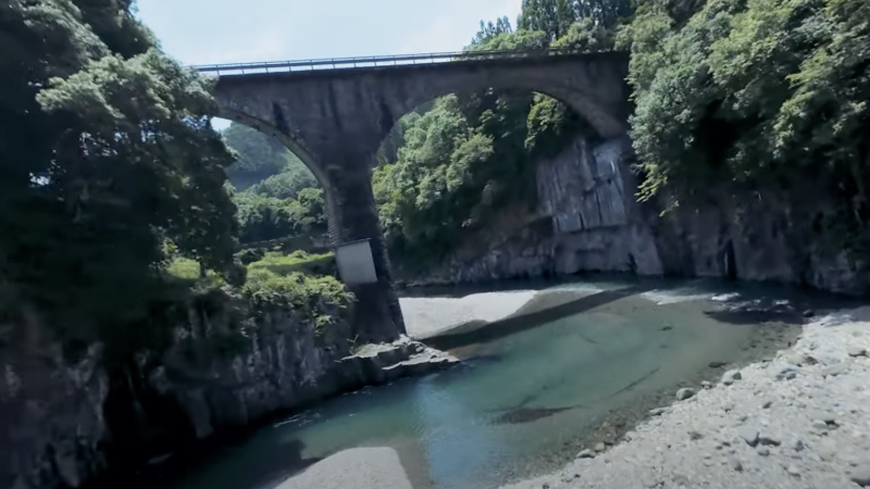 出会橋・轟橋は奥岳川にかかる近接したアーチ式の石橋です。轟橋は昭和9年に森林鉄道の橋として架けられた2連の橋で、広いほうの径間(アーチの幅)が32.1mと日本一を誇ります。一方、出会橋は大正13年に架けられ、径間が29.3mと日本第二位となってます。
